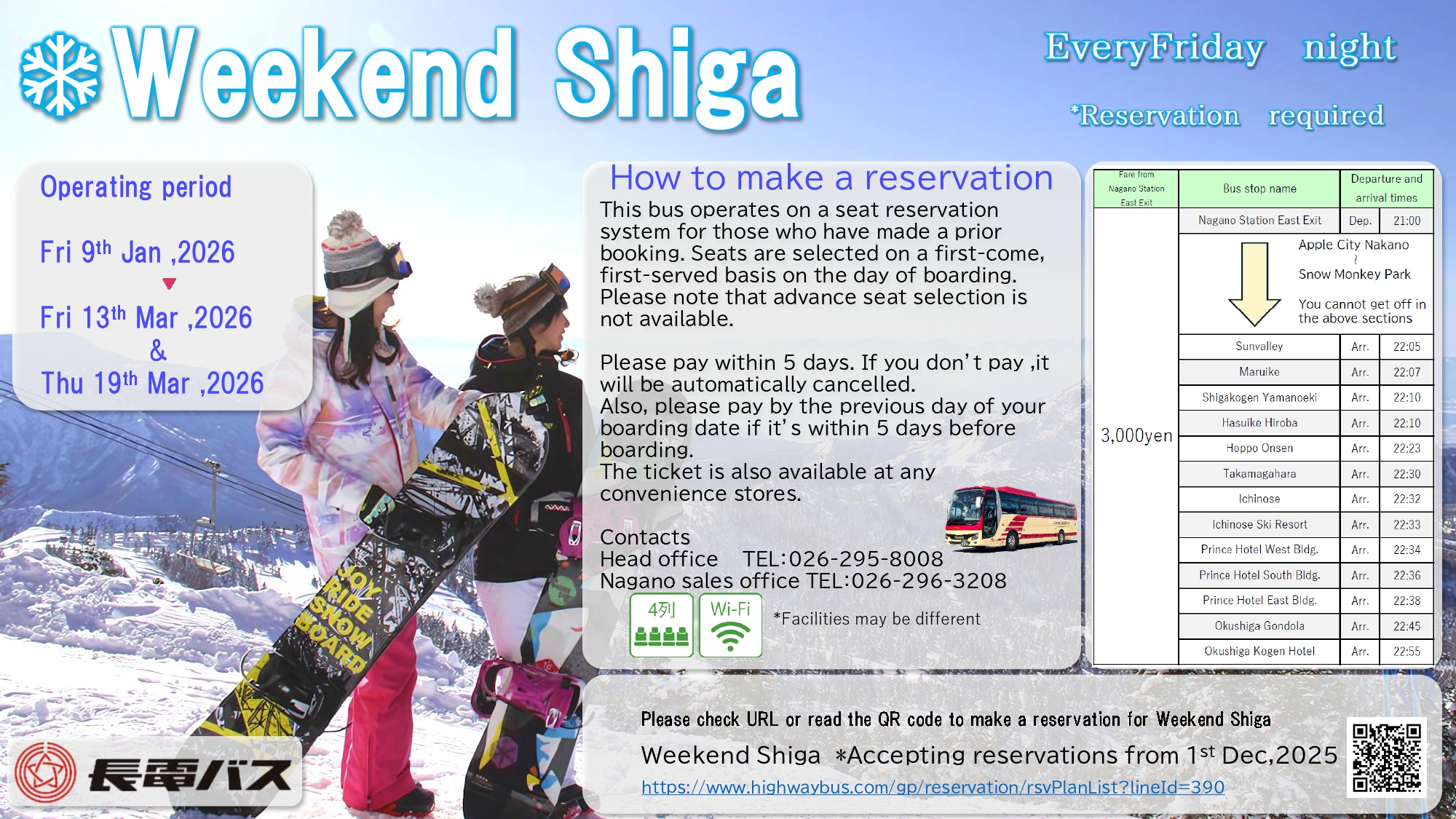 - The ★ yellow-marked services (Weekend Shiga) operate only on Fridays from 9 January to 13 March 2026, and on Thursday, 19 March. After departing from Nagano Station East Exit, the bus is for drop-off only. (Reservations open on Monday, 1 December 2025.)