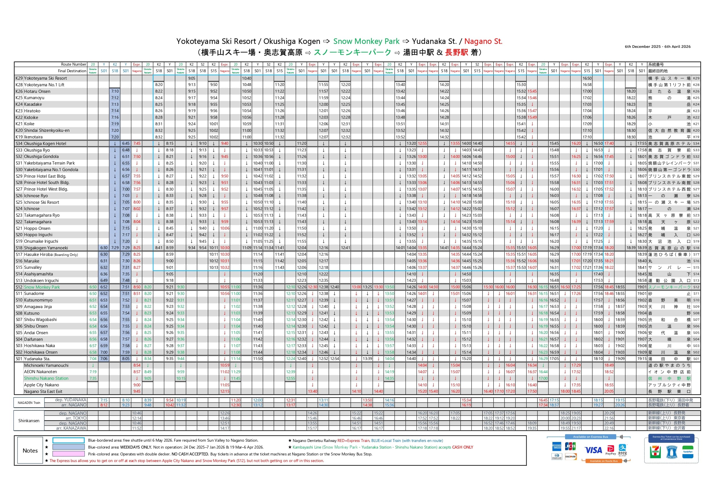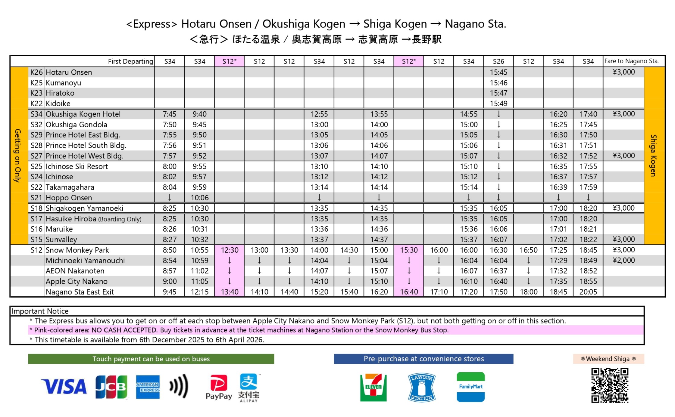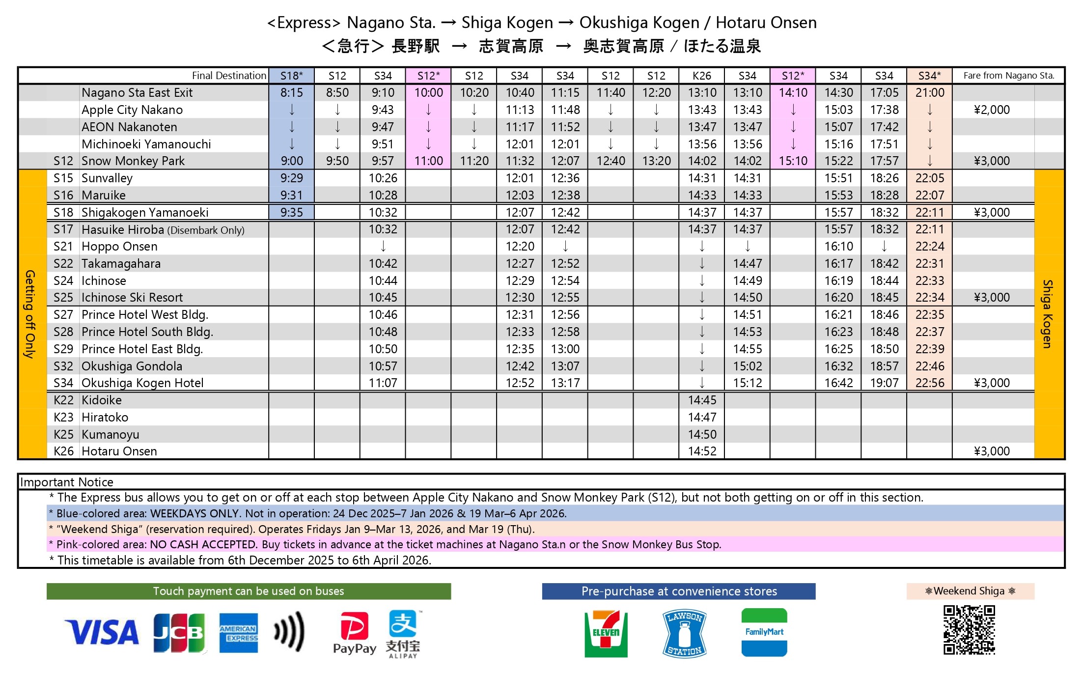 Express Bus Timetable – Shiga Kogen to Nagano Station