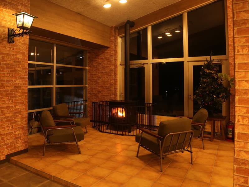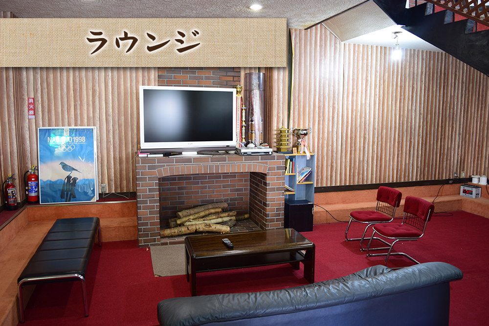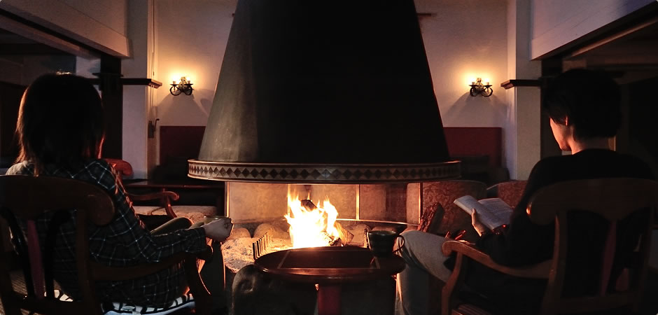 ロビーの薪ストーブでおくつろぎいただけます。 志賀高原一の瀬バス停目の前、志賀高原の雪解け水で育てたこだわりの自家米は食べ放題です。