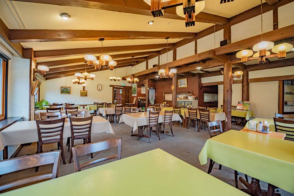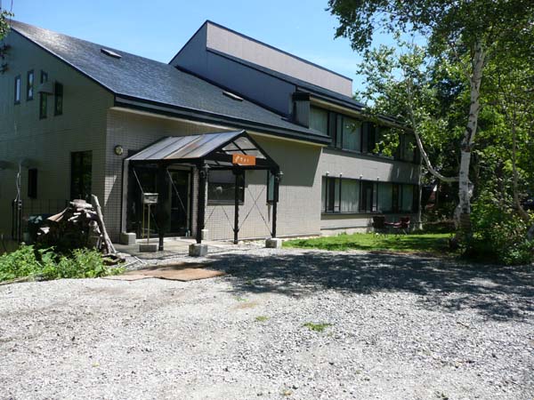 一の瀬に入って3軒目の赤い三角屋根が目印です。樹木に囲まれて、ちょっと引っ込んだ位置に建っています。 レストランはゲレンデ側にあり、冬はランチタイム営業もしております。