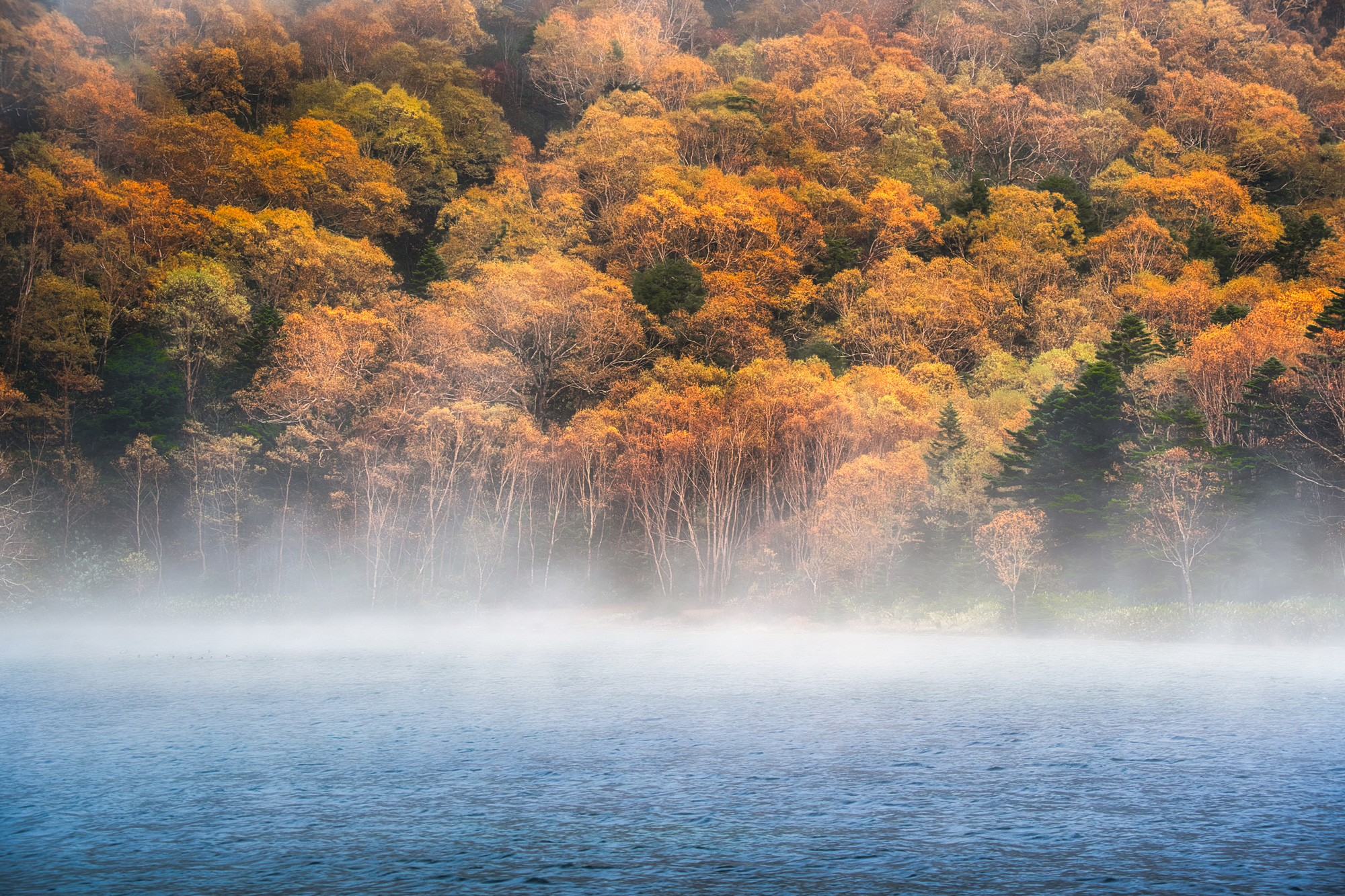 霧に包まれた大沼池!霧が一瞬晴れると幻想的な世界が!