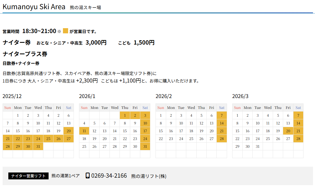 レンタルショップ:熊の湯スキー場ベルドール内レンタル、スノーキャン熊の湯・横手山店(要予約)